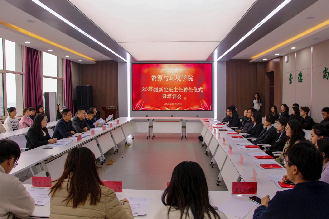 为深化落实立德树人根本任务,做好2025级本科新生的教育引导工作,10月29日,资源与环境学院在研楼718会议室举办2025级本科生班主任聘任仪式暨培训会。学院党委书记刘刹、院长曲建华、党委副书记袁洪波、副院长姜昭、院长助理宁玉翠、全体新生班主任、本科生辅导员及2025级学生代表参加此次活动。活动由学院党委副书记袁洪波主持。