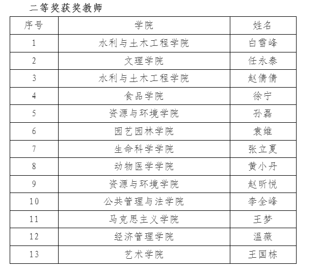 根据《东北农业大学课堂教学质量奖励管理办法》(东农教字〔2024〕5号)文件要求,我校组织开展了第六届课堂教学质量奖的评选工作。经学院推荐、教师申报、同行专家和教学督导随机听课、学生评价、现场教学观摩等评选程序,综合评选出东北农业大学第六届课堂教学质量奖获奖教师一等奖6人、二等奖13人、三等奖20人,我院教师孙磊、赵昕悦获课堂教学质量奖二等奖。