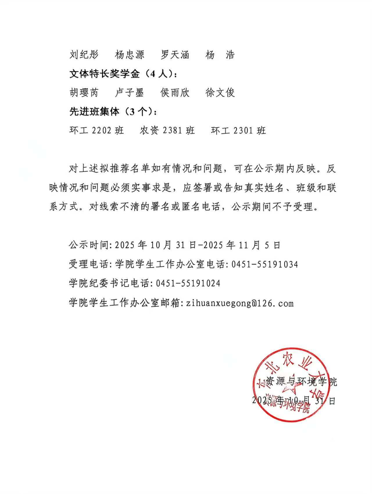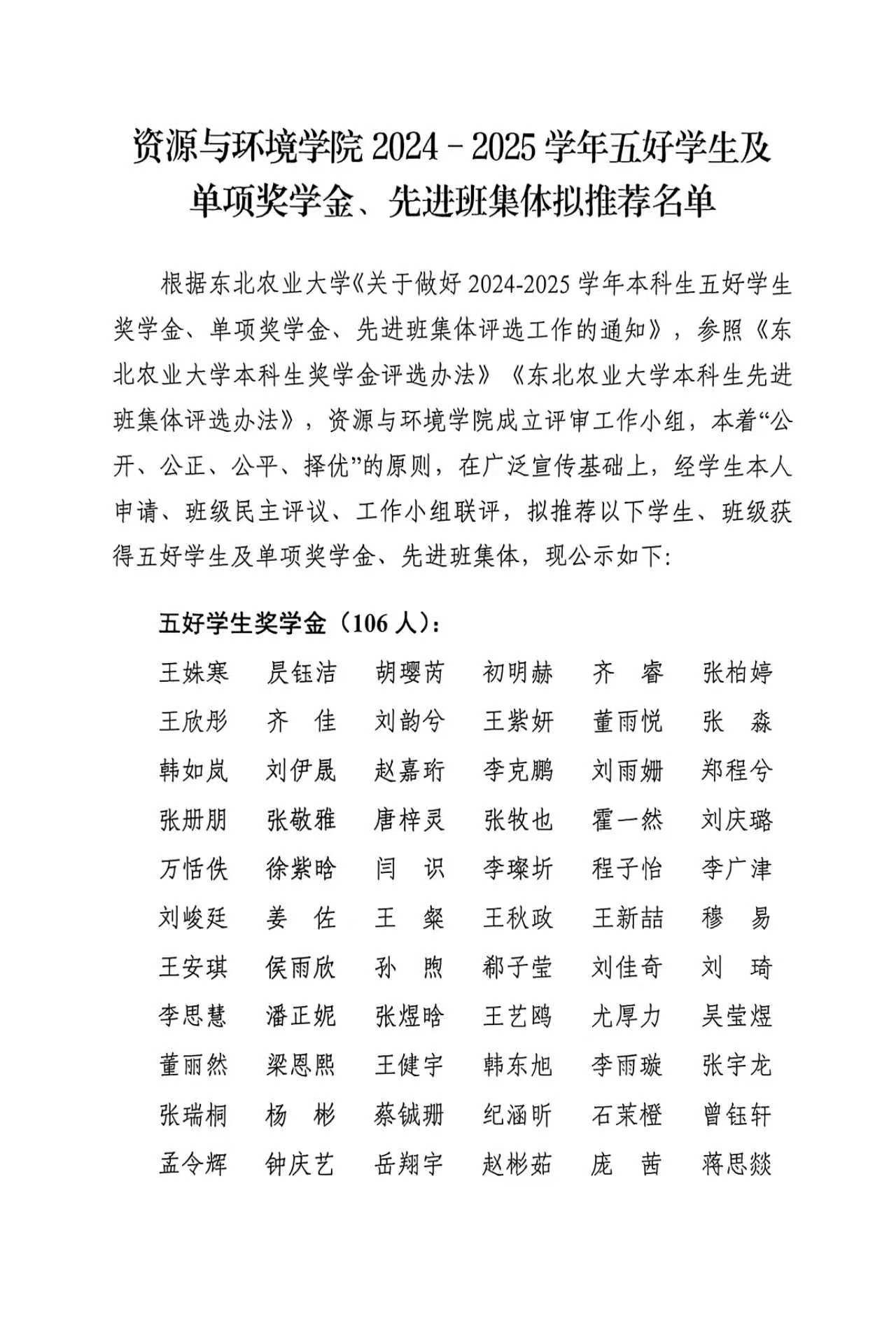 资源与环境学院2024-2025学年五好学生、单项奖学金及先进班集体拟推荐名单