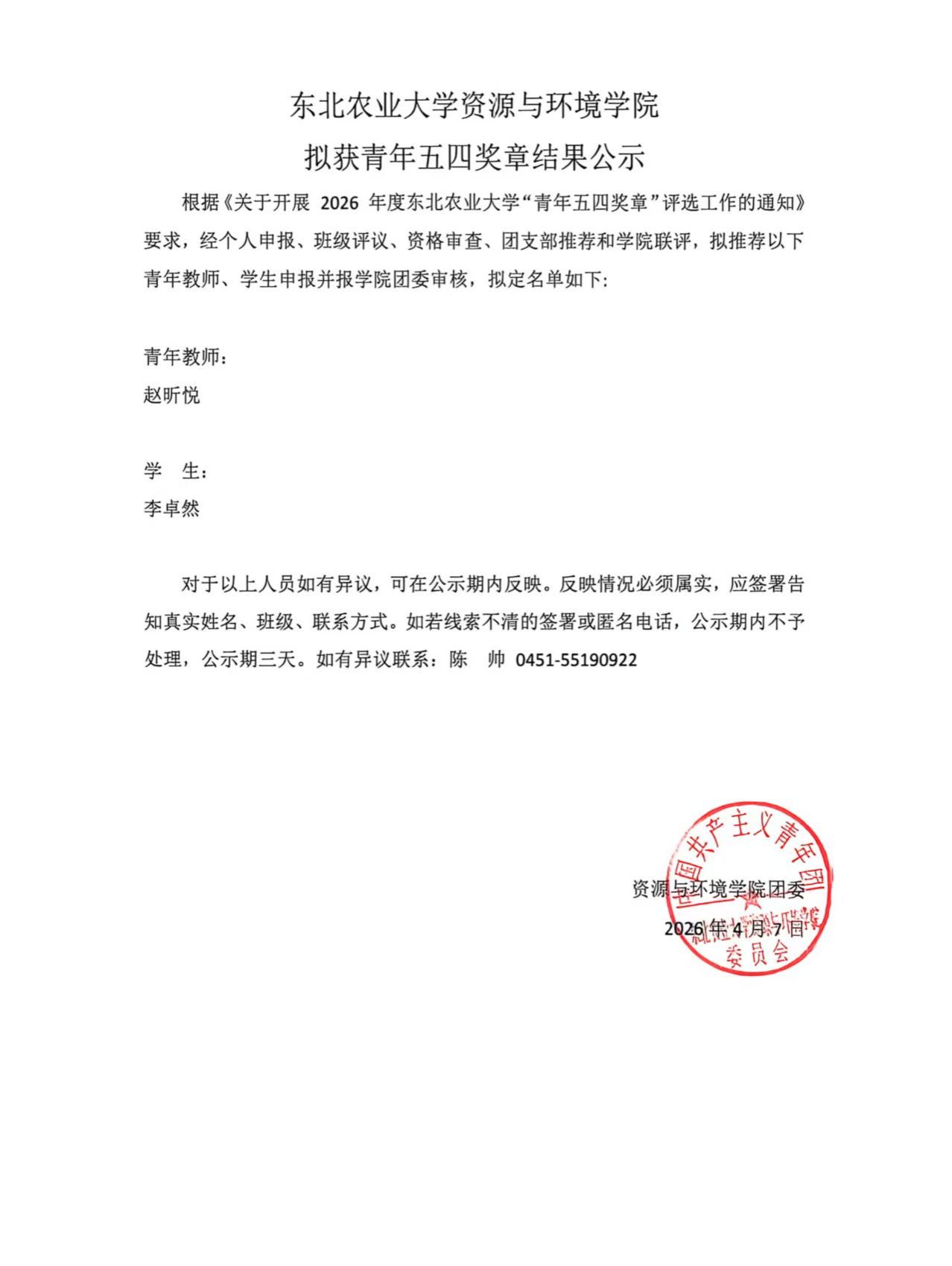 东北农业大学资源与环境学院拟获青年五四奖章结果公示