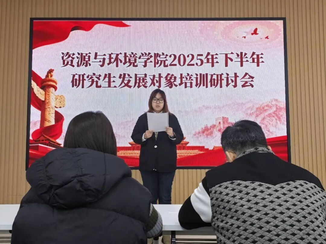 为深入学习贯彻党的二十届四中全会精神,切实加强研究生党员发展对象的培养教育,把好党员队伍的“入口关”和“质量关”,11月17日,资源与环境学院成功举办了研究生发展对象培训研讨会。本次研讨会围绕“青年责任担当”为主题,旨在引导发展对象深化对党的认识,端正入党动机,筑牢信仰根基,发挥先锋模范作用,做有理想、敢担当、能吃苦、肯奋斗的新时代好青年,以实际行动争取早日成为一名合格的共产党员。