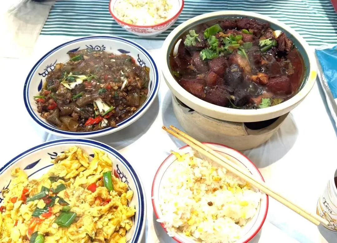 这桌家常菜,盛满了生活的温度。红烧肉在砂锅里泛着油光,酱汁裹着颤巍巍的肉块,葱花与香菜是点睛的绿意;油亮的粉条吸饱了肉末的鲜香,红椒与葱段在深色中跳跃;金黄的炒蛋蓬松柔软,带着锅气的焦香。