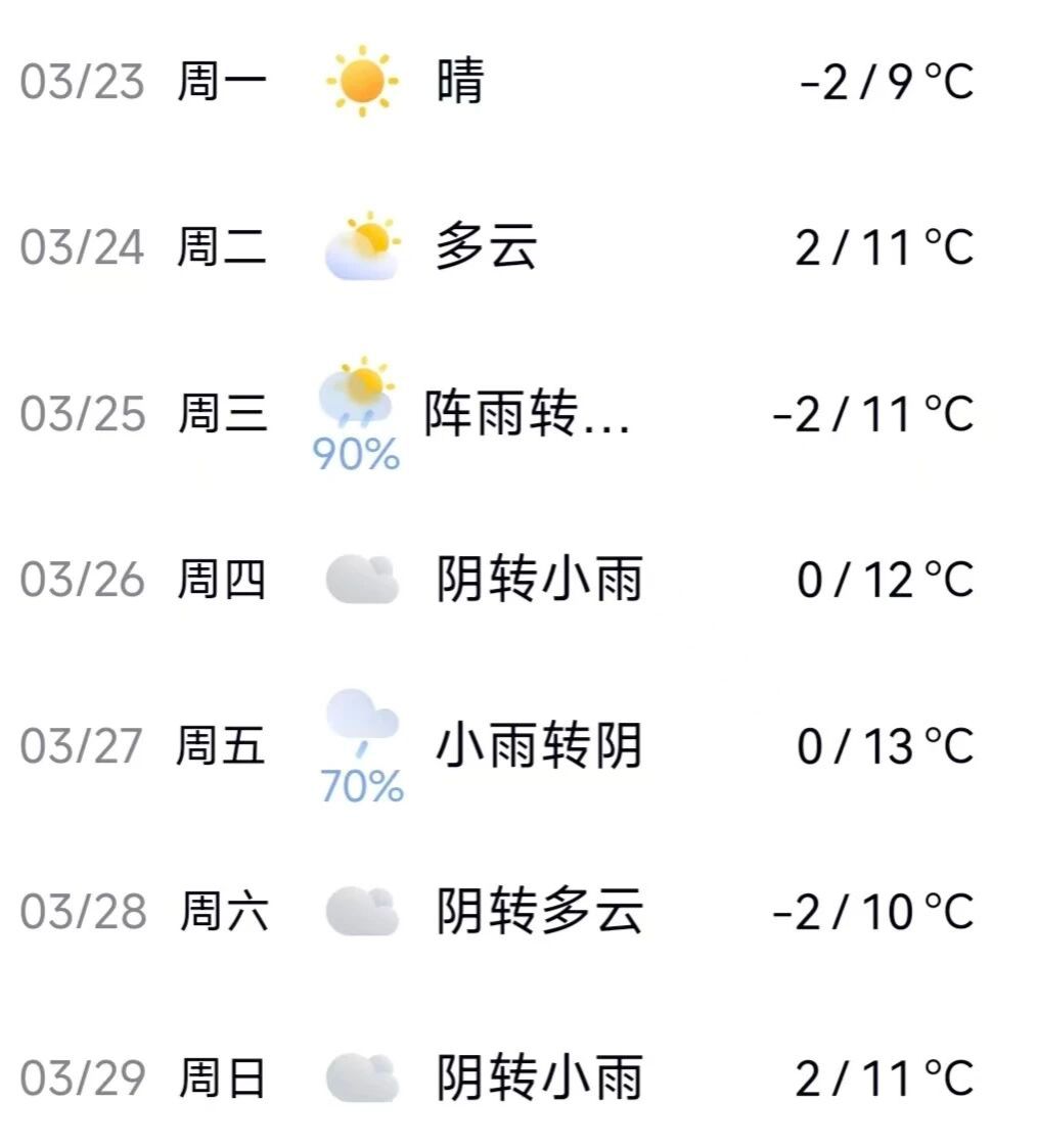 本周降雨很多,周一以晴开场,阳光充足,体感温和;周二云量增多,气温稳步回升。周三迎来阵雨,气温略有波动,周四持续阴天,空气湿润。周五有小雨,周末转为阴天,整体气温逐步攀升,周内最高温可达13℃。气温整体呈回升趋势,但昼夜温差仍较大,早晚凉意仍重,建议谨慎减衣,避免过早更换单薄春装。周三、周五有降水,出行请备好雨具,注意路面湿滑与添衣保暖。