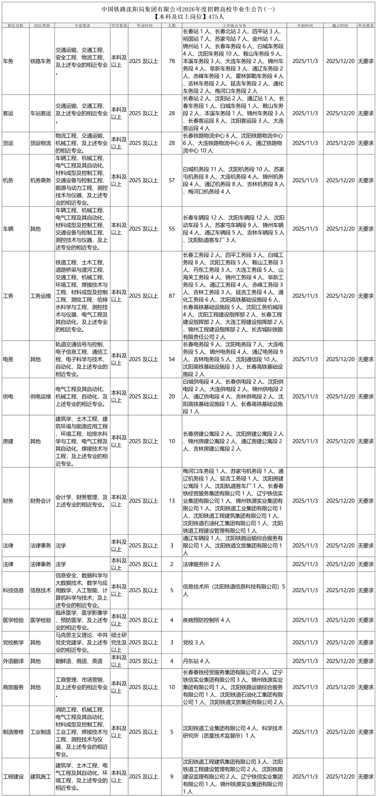中国铁路沈阳局集团有限公司2026年度招聘高校毕业生475人公告(本科及以上)