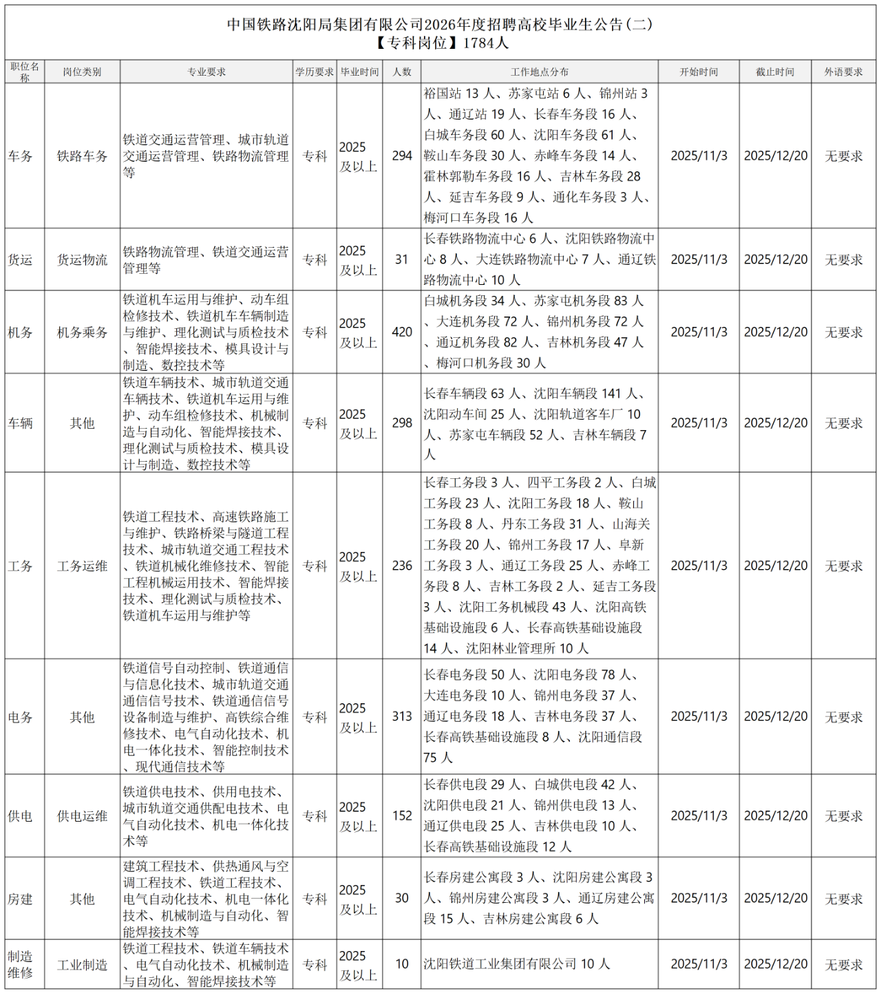 中国铁路沈阳局集团有限公司2026年度招聘高校毕业生1784人公告(专科岗位)